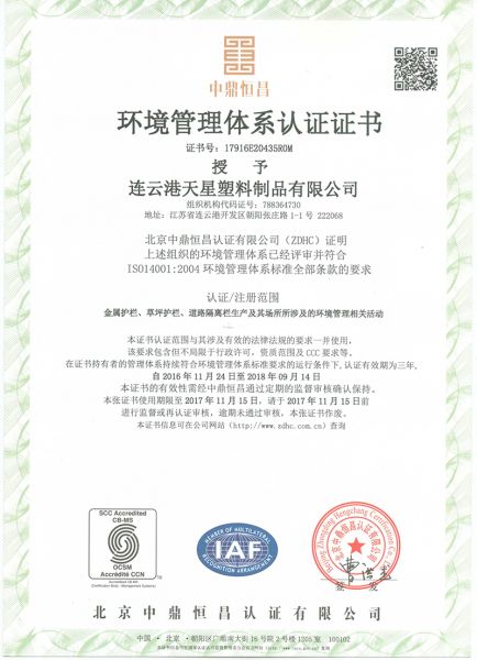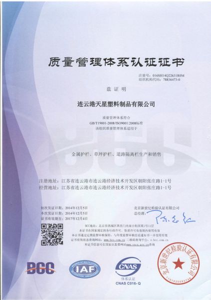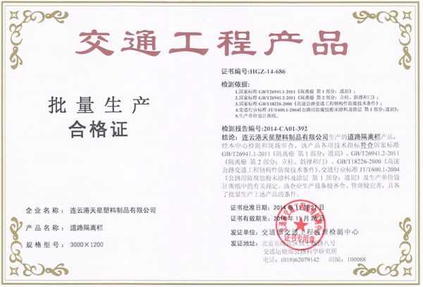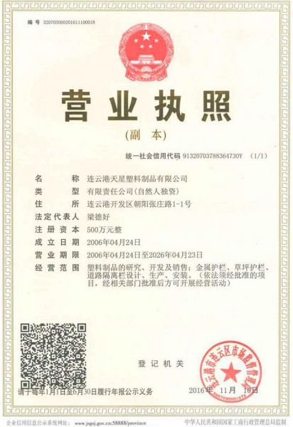 | 持证单位: 天星护栏(连云港天星塑料制品有限公司) |